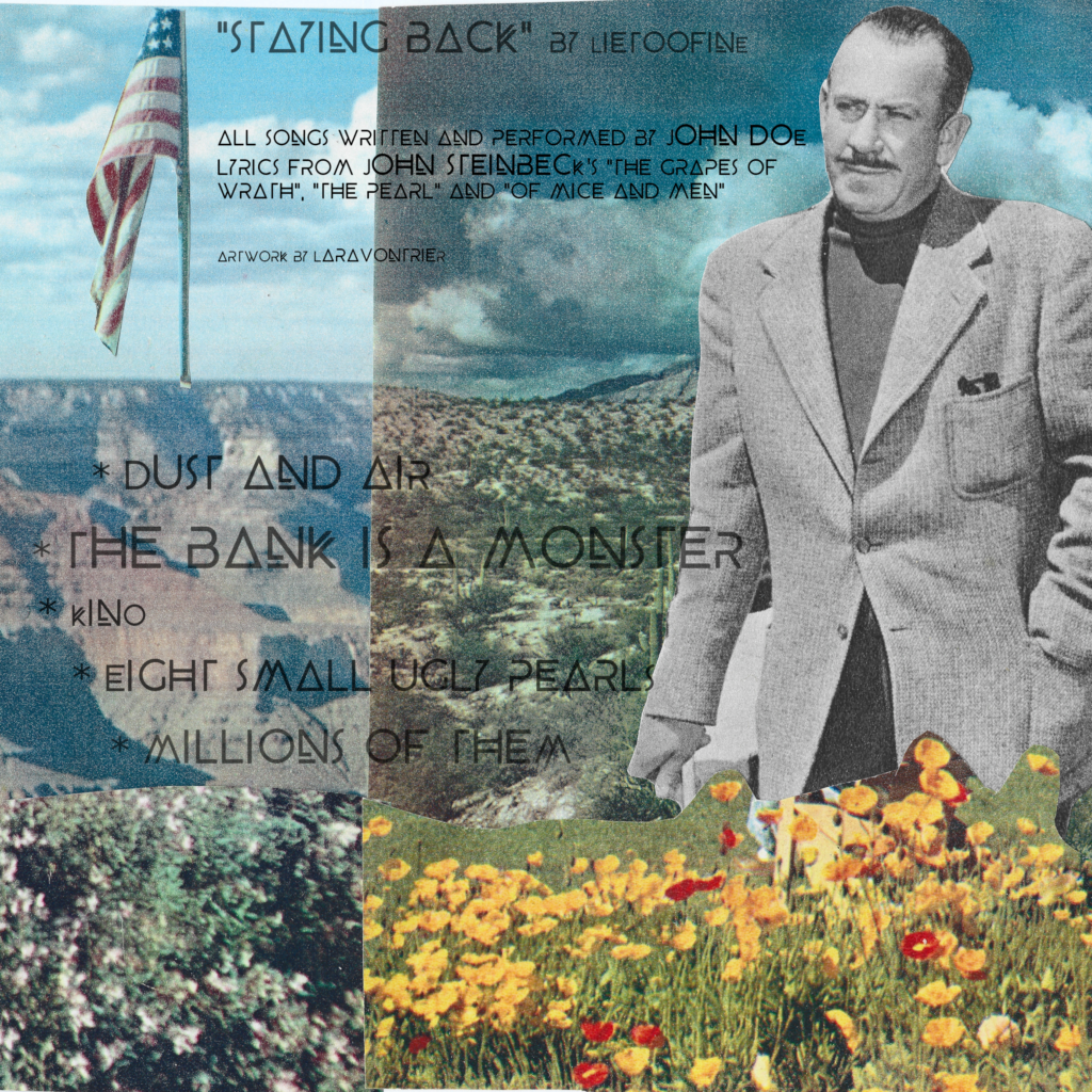 La copertina è un collage creato da me attraverso foto recuperate in una vecchia enciclopedia sull’America del Nord, anche questa capitata tra le mani per caso e contenente un ritratto di John Steinbeck.